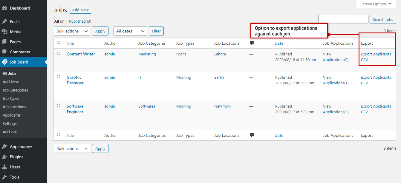 5. It automatically adds option for exporting applicants’ details under job listing and application listing pages.